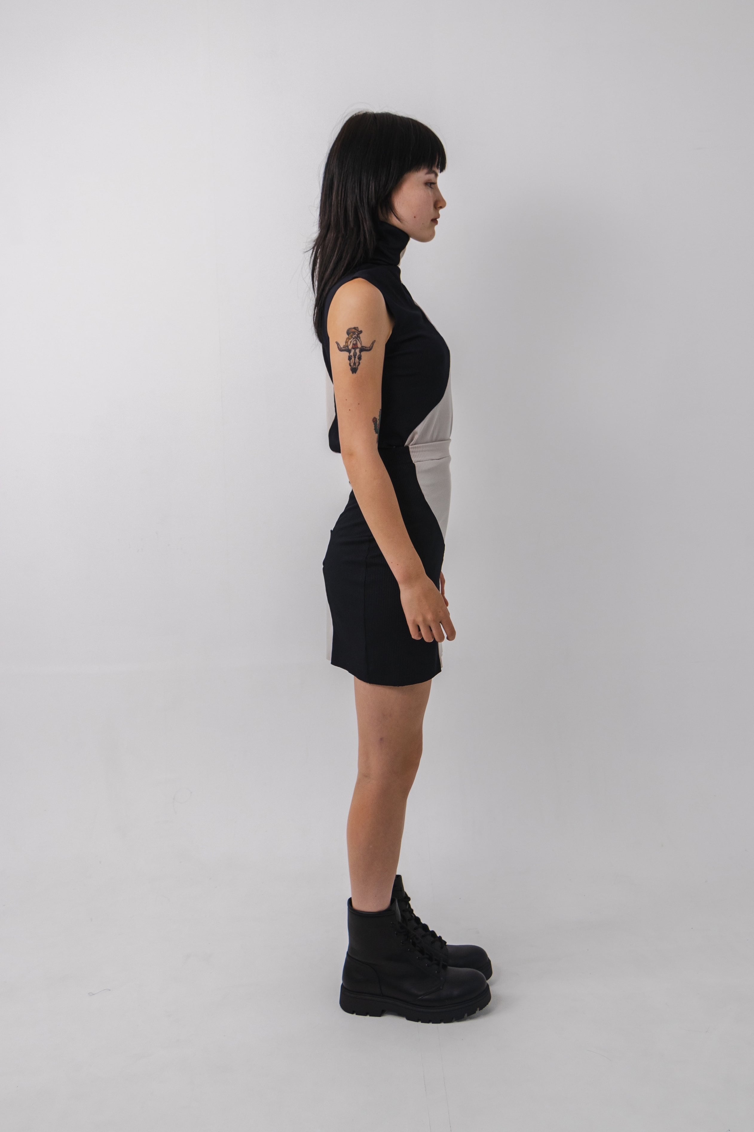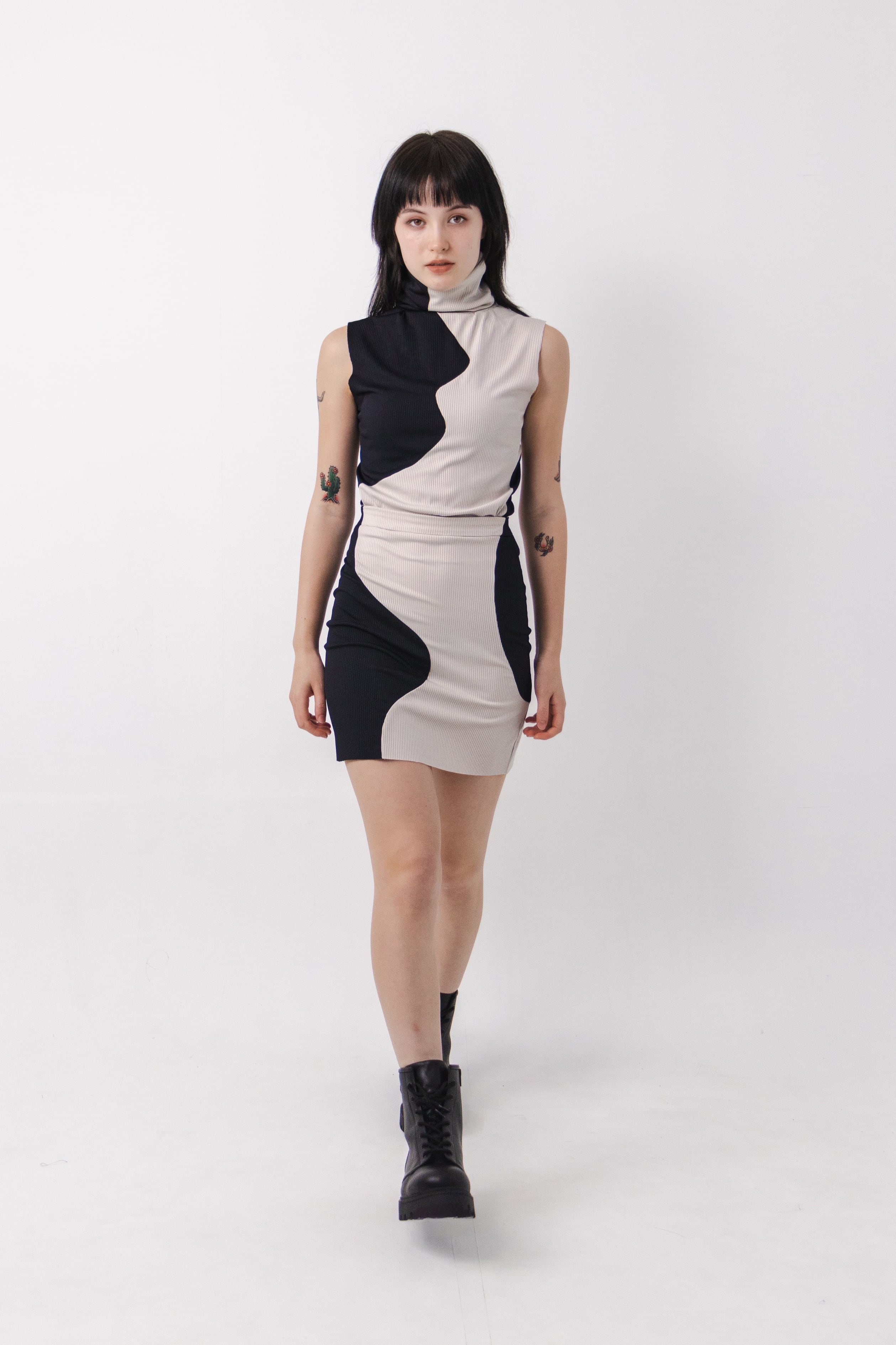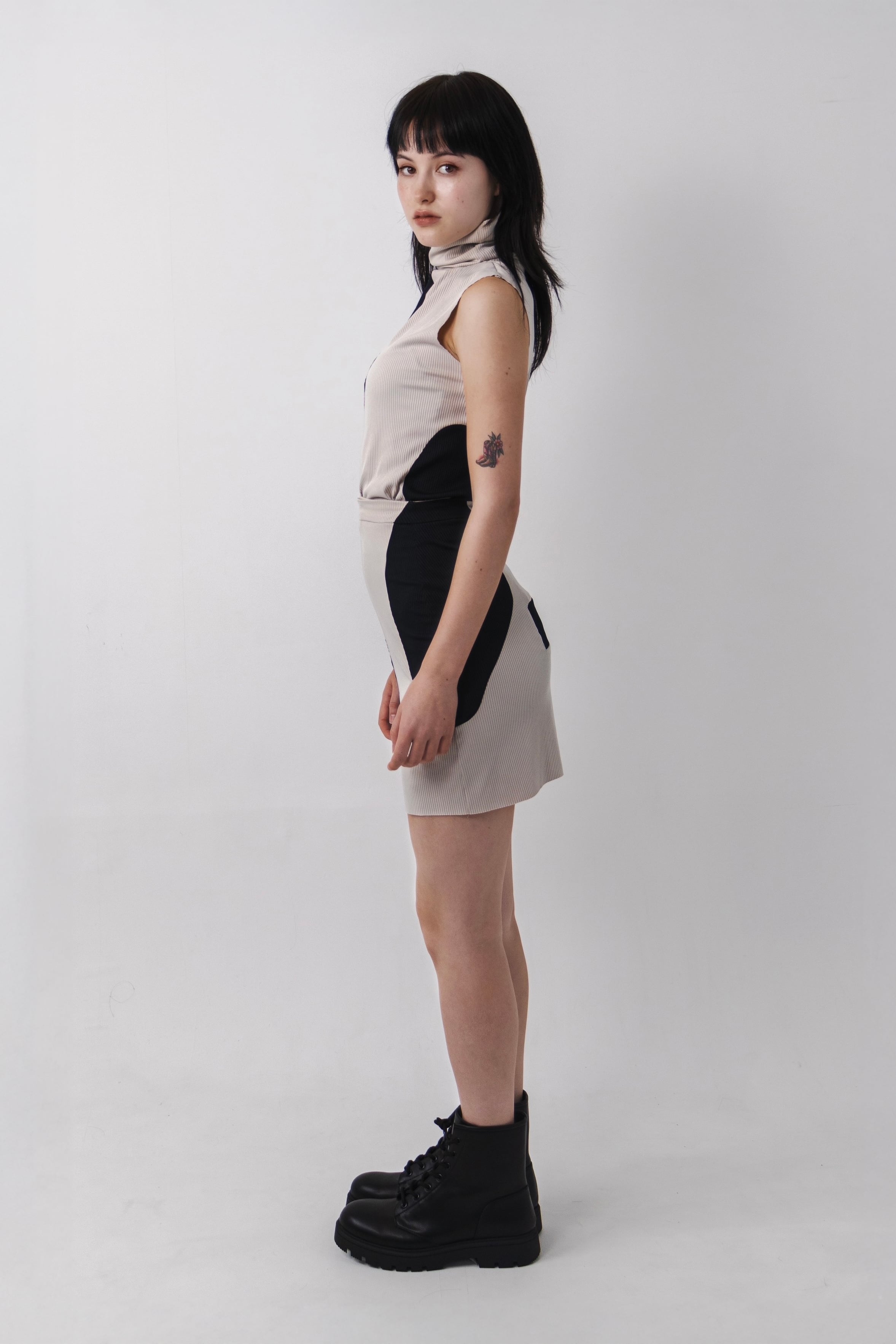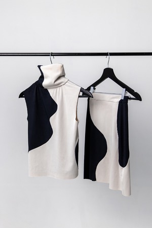 A set-up constructed from ribbed fabric panels shaped like geometric forms. The lines are carefully designed to flatter the female body, enhancing both charm and elegance. Made from highly stretchable fabric, it offers a stress-free, body-conscious fit. The color palette and panel lines are inspired by the landscapes of Hokkaido, reflecting the designer’s roots.