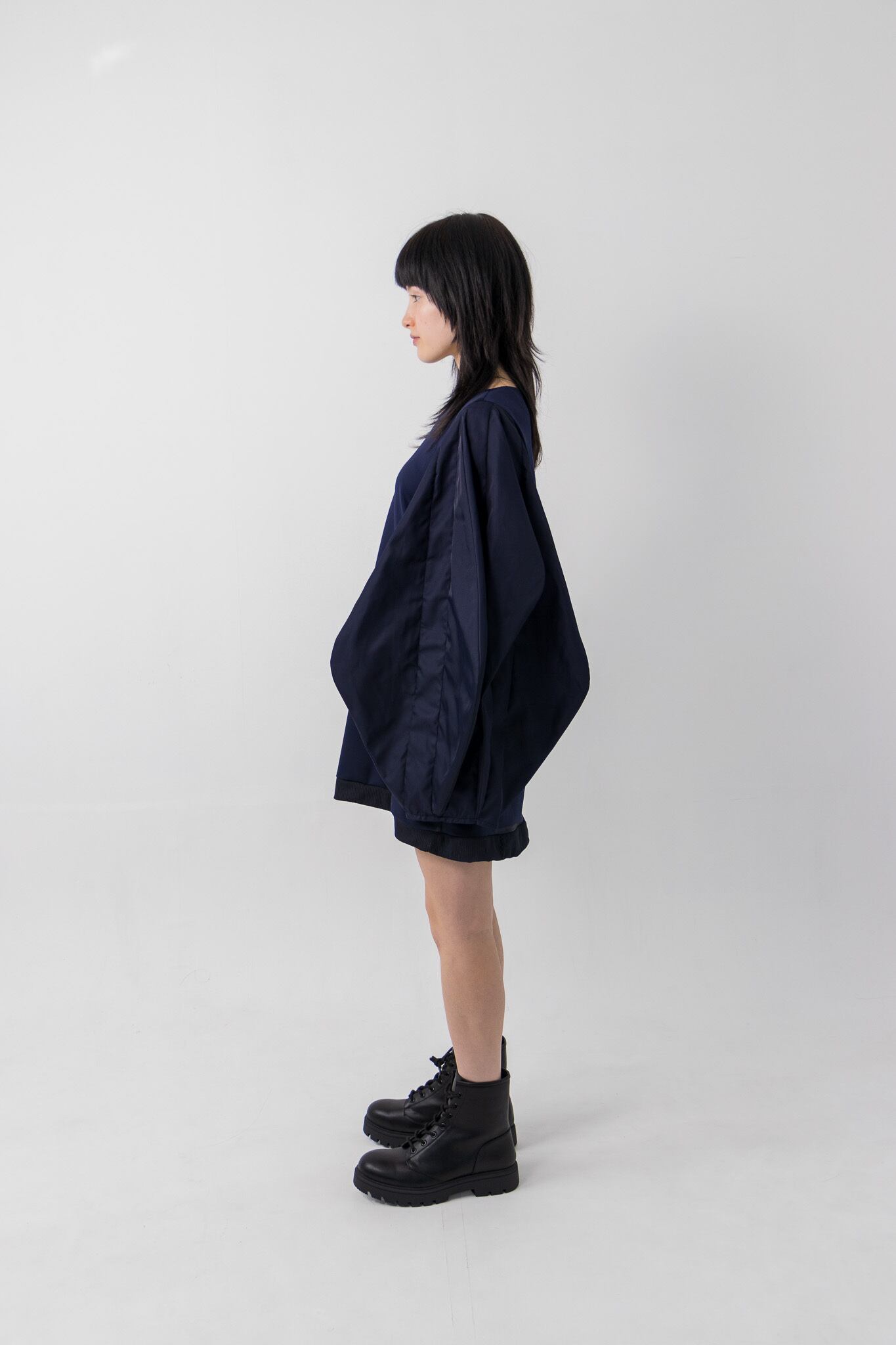 A dress featuring sleeves composed of diamond-shaped segments arranged like a cylinder. Named “Kaleidoscope Sleeves” for its intricate pattern-making of overlapping lines, the design combines a unique aesthetic with the comfortable fit of a nylon-blend bodice.