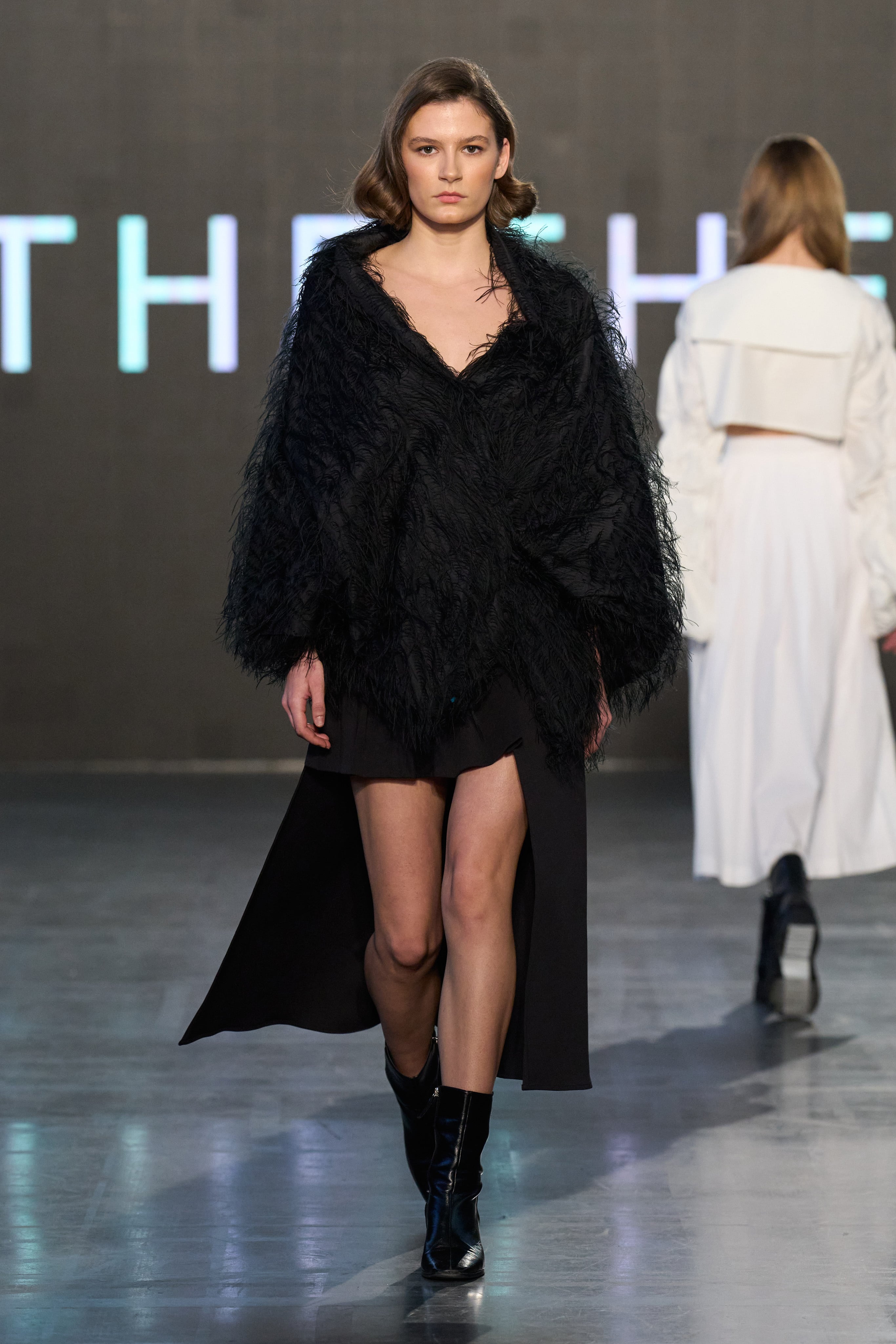 This cape coat is made of cut Jacquard fabric with a unique hair length.