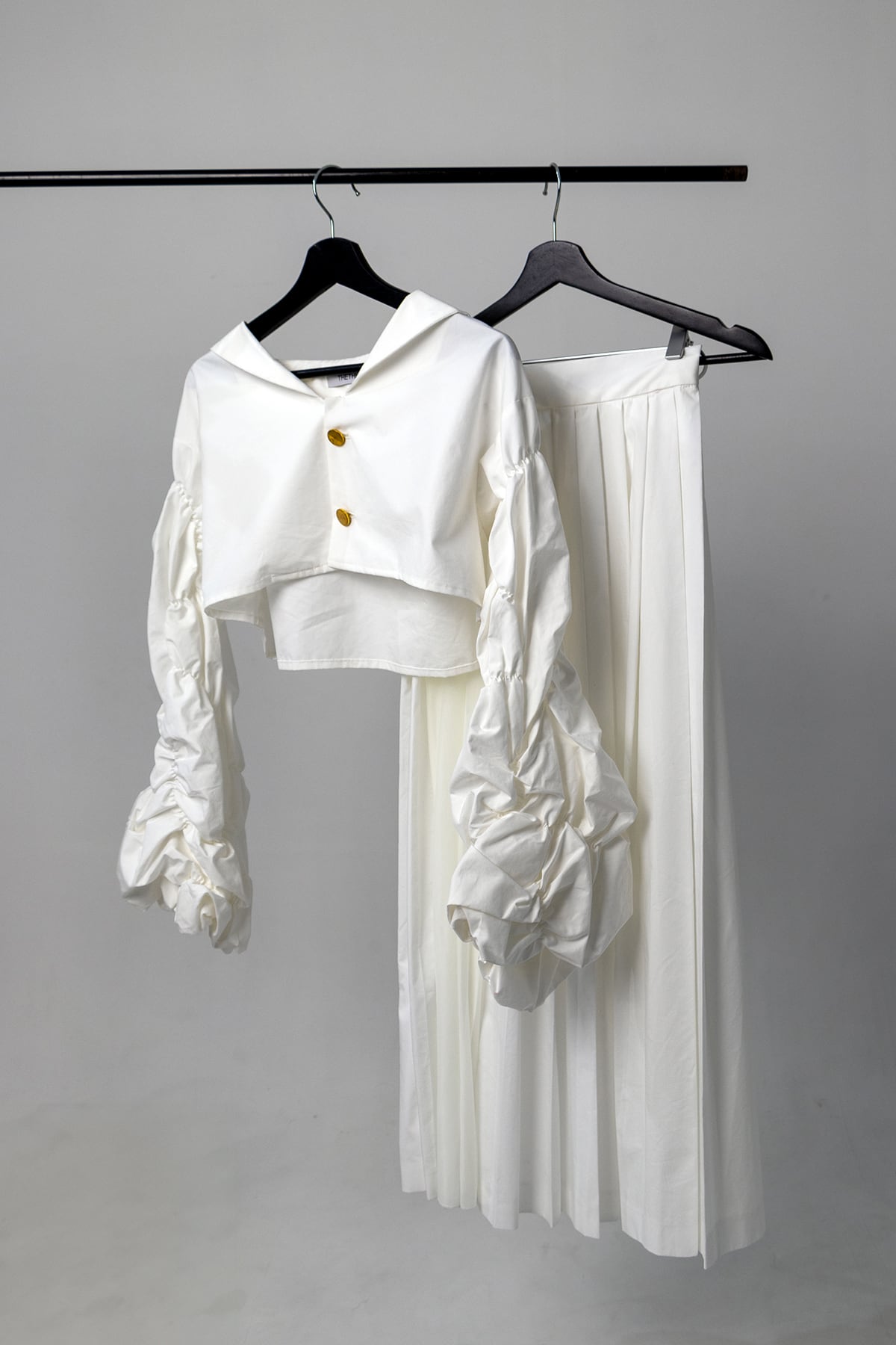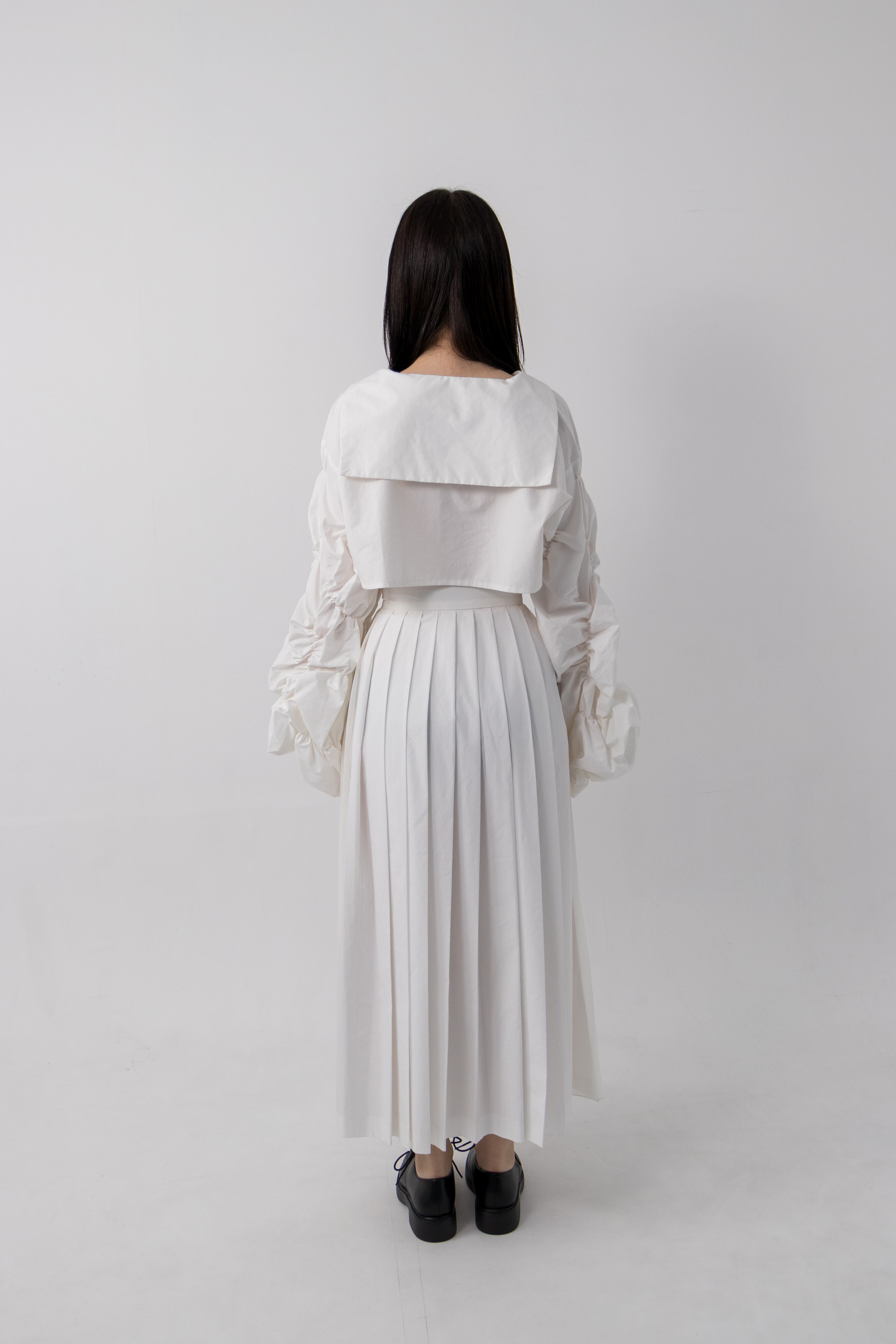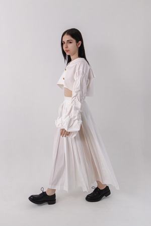 A pleated skirt inspired by the 1980s youth subculture “Sukeban.” The taffeta fabric is pleated to enhance the folds more vividly than a typical pleated skirt, giving it a striking presence when worn. The side seams are made from sheer material, allowing the skirt to be styled in both feminine and elegant ways.